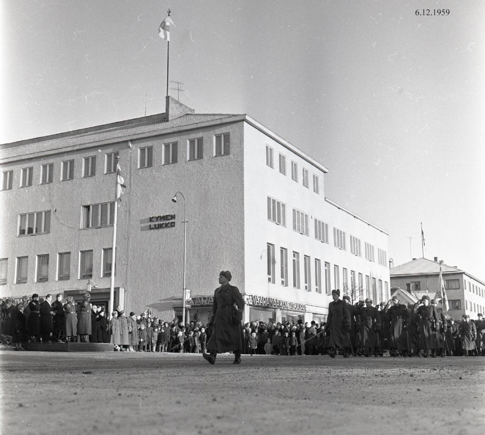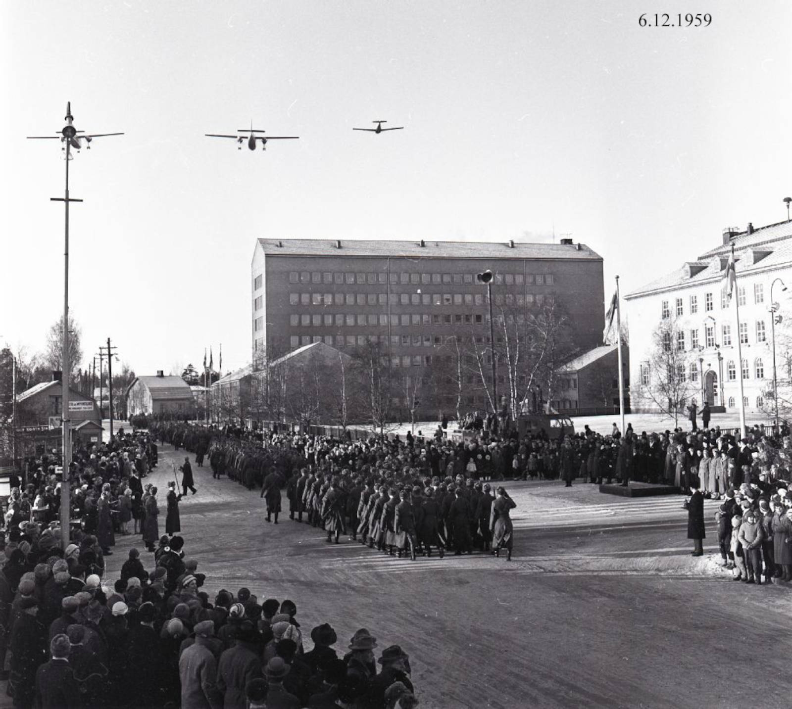 Itsenäisyyspäivän paraatin lento-osastojen osuus jäi tänä vuonna noin 15000 kadun varren seuraajan pettymykseksi huonon lentosään vuoksi äänihavaintoihin pilvessä lentäneistä hävittäjistä. Eero Suikin vuoden 1959 kuvassa paraatin lento-osuudessa kahden Karjalan Lennoston Kuljetuslentueen Pembroke-kuljetuskoneen ja yhden Saab Safirin muodostelma on juuri ylittänyt Kymen Lukon. Pembroket nopeampina ovat tasanneet nopeutensa hitaamman Safirin tasolle laskutelineet ulkona.